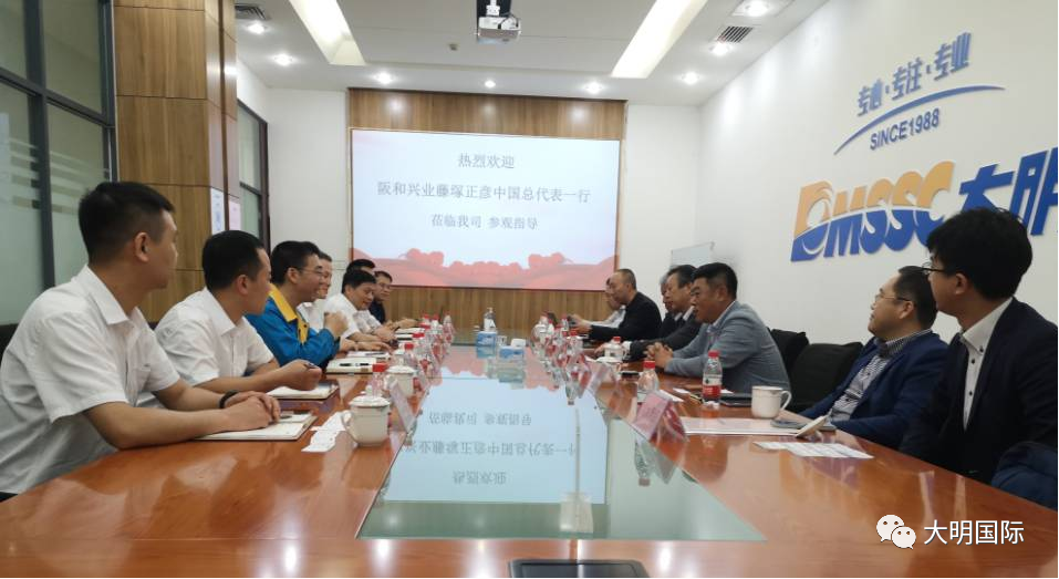 6月2日,阪和興業(上海)管理有限公司中國總代表藤塚正彥、董事長特別助理米原佳彥、阪和(大連)總經理劉鐘男等領導率阪和上海、天津、大連團隊一行7人來訪大明天津加工中心。大明天津加工中心總經理于長江、副總經理夏紅衛、副總經理張帆等熱情接待并座談交流。